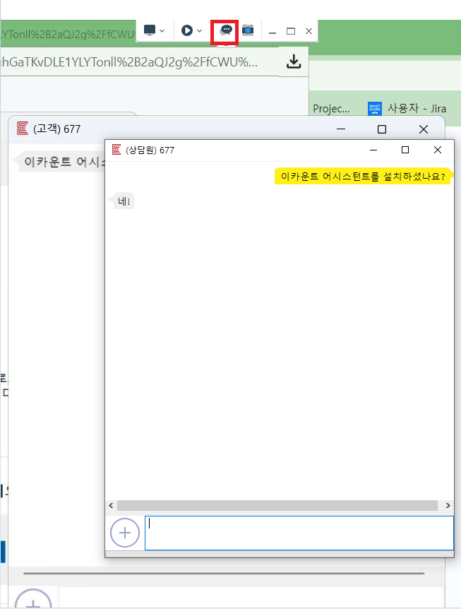 상단의 채팅 아이콘 클릭 시 상대방과 채팅을 할 수 있는 창이 열립니다. 따라서 유선 전화연결이 없이도 상대와 소통하면서 원격지원을 진행할 수 있습니다.