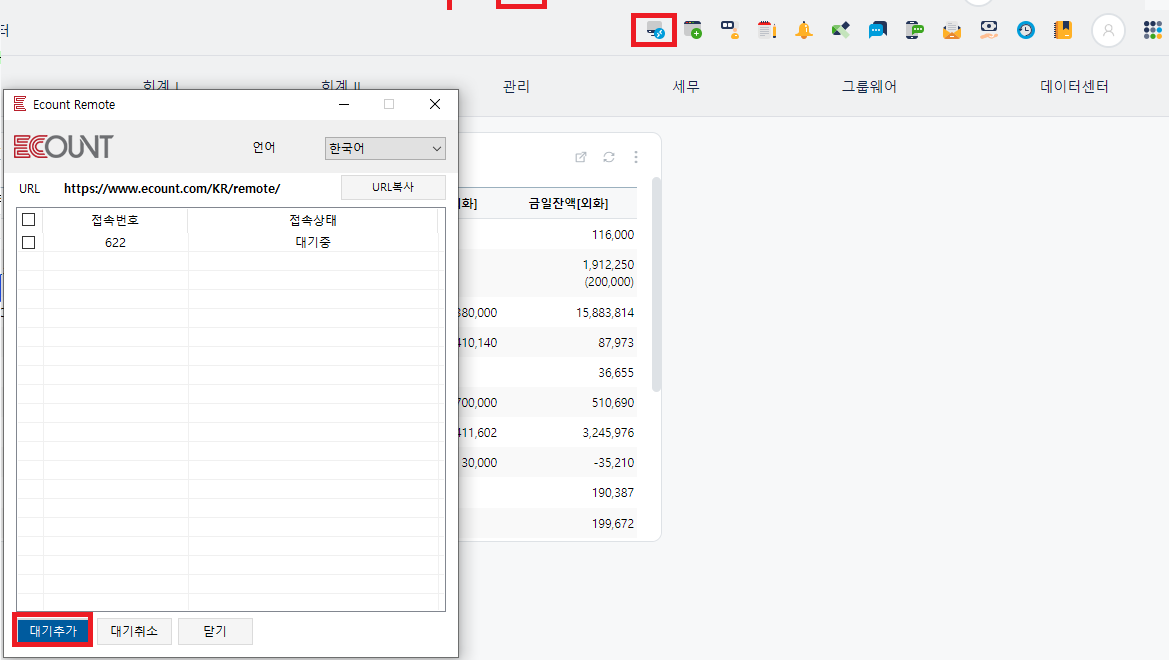그리고 하단 대기추가 버튼을 클릭하시면 접속번호 한 줄이 표시됩니다. 이 접속번호를 현재 나에게 원격지원을 요청할 클라이언트(상대) 에게 알려주면 됩니다.