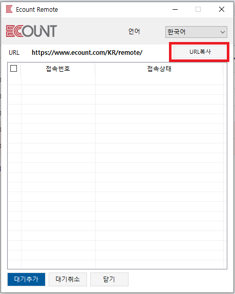 두 번째 방법은 위에서 원격지원 아이콘 클릭 시 나타났던 팝업의 URL 복사를 클릭하여 해당 주소를 상대 거래처에게 알려주어 접속하도록 하는 방법입니다. 아래 화면에서 표시된 URL 주소가 복사되며 이 주소를 메일, 문자 등으로 상대에게 알려주면 똑같이 위와 같은 원격지원 서비스 안내 팝업으로 들어올 수 있게 됩니다. 상대가 이카운트 프로그램 미사용자일 경우 이 방법을 통해 원격지원 요청을 하도록 하면 편리합니다.