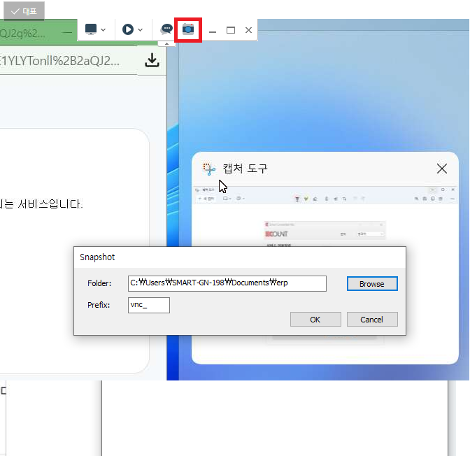 상단의 캡쳐 아이콘을 클릭 시 아래와 같이 원격지원 중 화면을 캡쳐할 수 있도록 내컴퓨터의 저장경로를 설정하도록 snapshot 팝업창이 뜹니다. Browse 클릭하여 저장경로를 지정하고 캡쳐작업을 진행합니다.