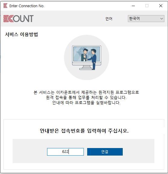 거래처가 원격지원 프로그램 실행 버튼 클릭 시 아래와 같이 안내받은 접속번호를 입력해달라는 창이 뜨게 됩니다. 위에서 대기추가 버튼을 클릭했을 때 표시되었던 대기번호를 적고 연결 버튼을 클릭하도록 안내합니다.