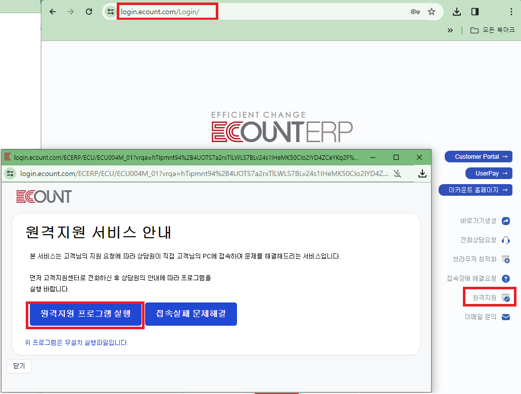 대표적으로 두 가지 방법이 있습니다. 첫 번째는 아래와 같이 이카운트 로그인 페이지를 상대가 알고 있는 경우, 해당 페이지 우측의 원격지원 을 클릭하고 바로 원격지원 프로그램 실행 을 클릭하도록 하는 것입니다. 상대 거래처도 이카운트프로그램을 사용하는 경우면 간단히 이렇게 접속하도록 유도합니다.