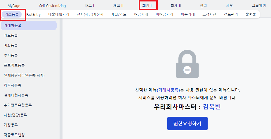 위처럼 설정된 ID가 이카운트프로그램에 접속한 화면 예시입니다. 불필요한 메뉴들은 모두 걷어내고 현재 ID가 봐야할 메뉴만 나타나게 됩니다.