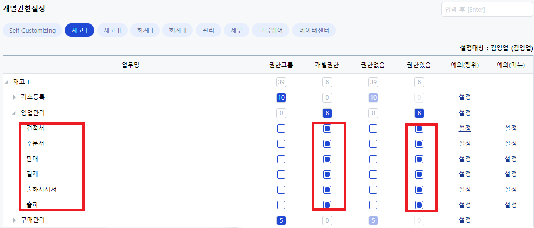 예를 들어 현재 ID는 영업사원이며, 영업관리 관련 모든 메뉴들에 대해 조회권한을 주고, 그 중에서도 입력권한 은 판매 쪽에만 적용하려고 한다고 가정해보겠습니다. 아래와 같이 재고Ⅰ- 영업관리 하위의 모든 메뉴에 대해 개별권한 에 체크 후 권한있음 에 체크하였습니다. 그런데, 판매 를 제외하고 다른 메뉴에 대해서는 조회 기능만 제공해야하는 상황입니다.