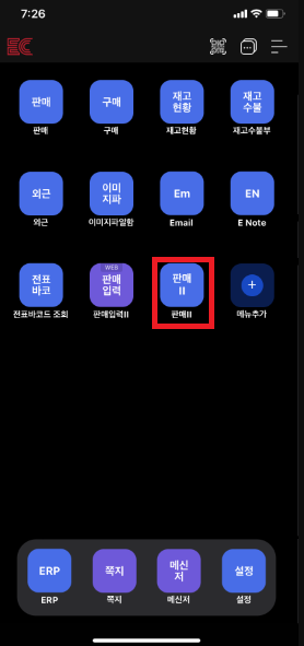 이카운트 APP을 스마트폰에 설치하면 모바일로도 결제를 받을 수 있습니다. 아래와 같이 이카운트 APP에 접속하여 판매Ⅱ 아이콘을 클릭합니다.