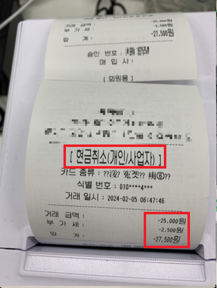 영수증 품목표기여부 를 '품목표시안함'으로 선택한 경우 아래 사진의 왼쪽과 같이 영수증이 출력될 것이고, 품목표시를 선택한 경우 아래 사진의 오른쪽 (빨간표시) 영수증과 같이 출력될 것입니다. 참고 바랍니다.