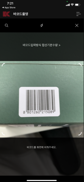 스마트폰 카메라로 바코드스캔을 하거나 우측 상단 X 클릭 후 직접 품목명으로 검색하여 품목가 수량을 선택합니다.