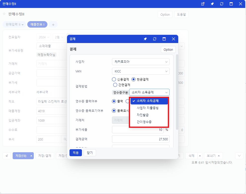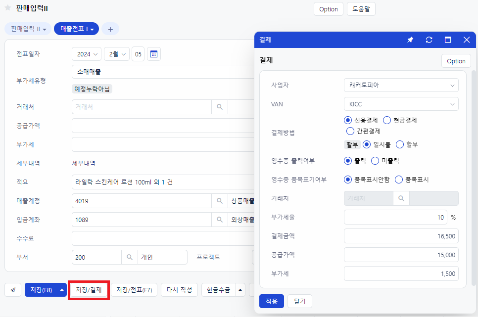 판매내역이 작성되었으면 하단의 저장/결제 버튼을 클릭합니다.