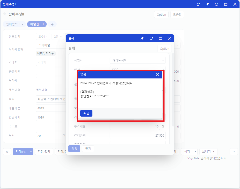 결제절차 완료 시 아래와 같이 판매전표가 발행되었다는 알럿이 뜹니다.