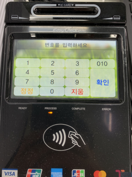 안내에 따라 신용카드를 카드단말기에 꽂고 단계에 따라 서명을 진행합니다.