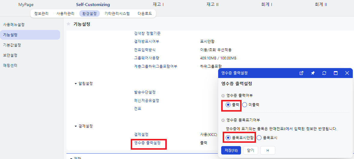 - 영수증 품목표기여부 선택 (기본값은 위 Self-Customizing에서 설정한 값)