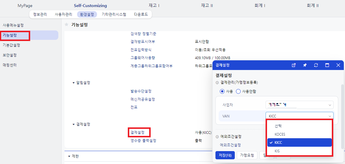 경로 : Self-Customizing > 환경설정 > 기능설정 > 결제설정