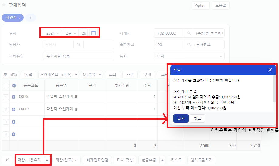아래와 같이 판매입력 후 저장/내용유지 클릭 시 판매저장을 바로 하지 않고 알림 메세지가 뜹니다. 여신 기간을 초과하였다고 안내합니다. 현재 기준으로 7일 전은 '24.02.19 이며, 당시의 미수잔액은 1,002,750원이 존재합니다. 그 이후 수금액은 없으므로 수금이 완료되지 않았습니다. 따라서 현재 '24.02.26 기준으로 판매입력을 제한하고 있는 것입니다.