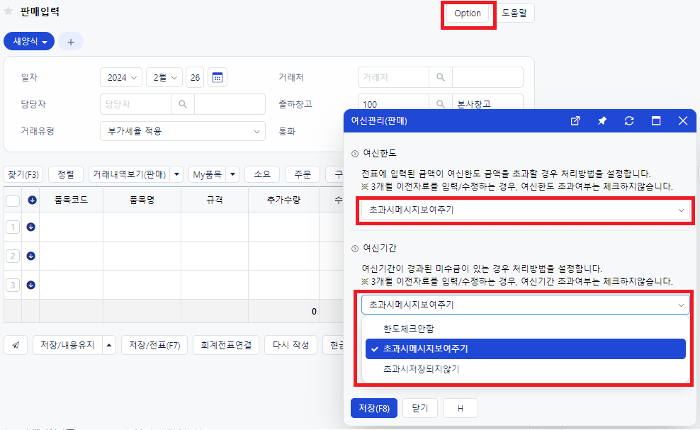 초과시메세지보여주기 로 설정시, 판매입력 저장 시 해당 거래처에 설정한 여신한도를 초과하거나 여신기간이 지났다면 메세지를 보여주며, 입력한 내용 저장은 할 수 있게 선택할 수 있습니다. 초과시저장되지않기 는판매입력 저장 자체를 제한합니다.