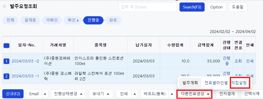 발주요청조회 - 진행중 탭에서 발주계획으로 넘길 전표들을 체크한 뒤, 하단 다른전표생성 > 전표별라인별 or 직접생성 을 클릭합니다. 간단하게는 전표별라인별을 클릭합니다. 전표별라인별 클릭 시 발주요청에서 작성한 전표별라인별 그대로 발주계획이 작성됩니다. 만약, 같은 구매처 별로 발주계획을 작성하거나 같은 품목이면 라인을 합치거나 등의 방식으로 발주계쇡을 작성하려면, 직접설정 을 클릭합니다. 아래 예시에서는 직접설정 방법으로 설명 드리겠습니다.