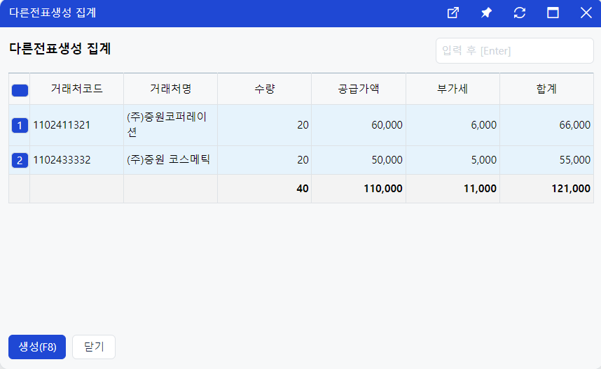 위와 같이 설정 후 적용 클릭하면 아래와 같이 발주계획전표를 작성할 부분에 대한 집계 화면이 보여집니다. 같은 구매처이면 한 장의 발주계획전표를 작성하기로 하였으므로 아래와 같이 거래처별로 집계한 화면이 뜹니다. 문제가 없다면 모두 체크 후 하단의 생성 버튼을 클릭하여 발주계획을 생성합니다.