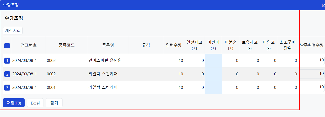 - 발주확정수량 = 입력수량 + 안전재고 + 미판매 + 미불출 - 보유재고 - 미입고