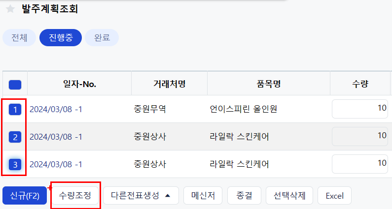 발주계획조회에서는 진행상태 확인 및 발주계획수량을 확정할 수 있습니다.