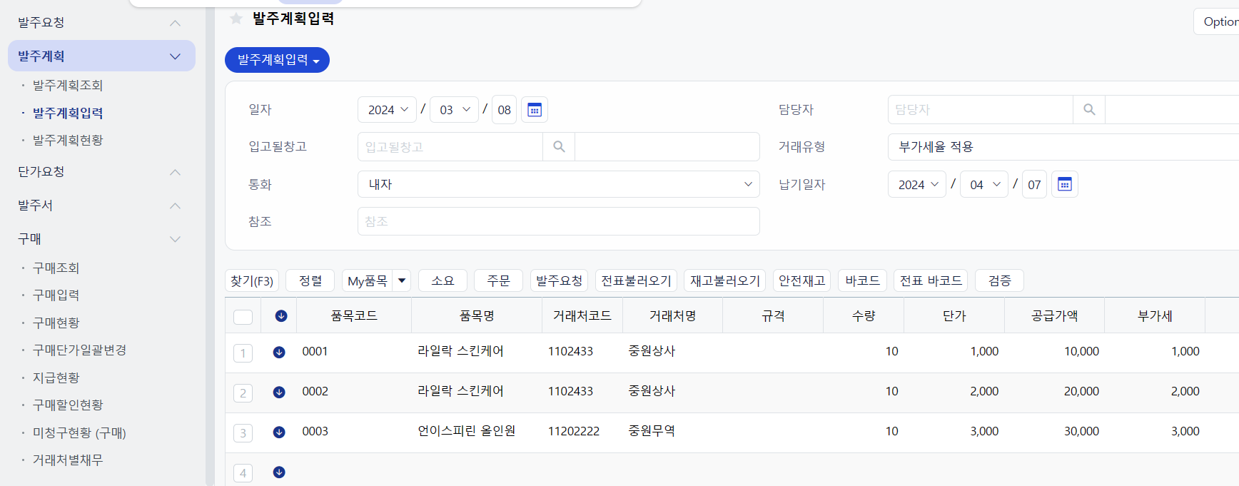 그렇기 때문에 거래처별로 발주계획을 따로 입력할 필요가 없습니다.
