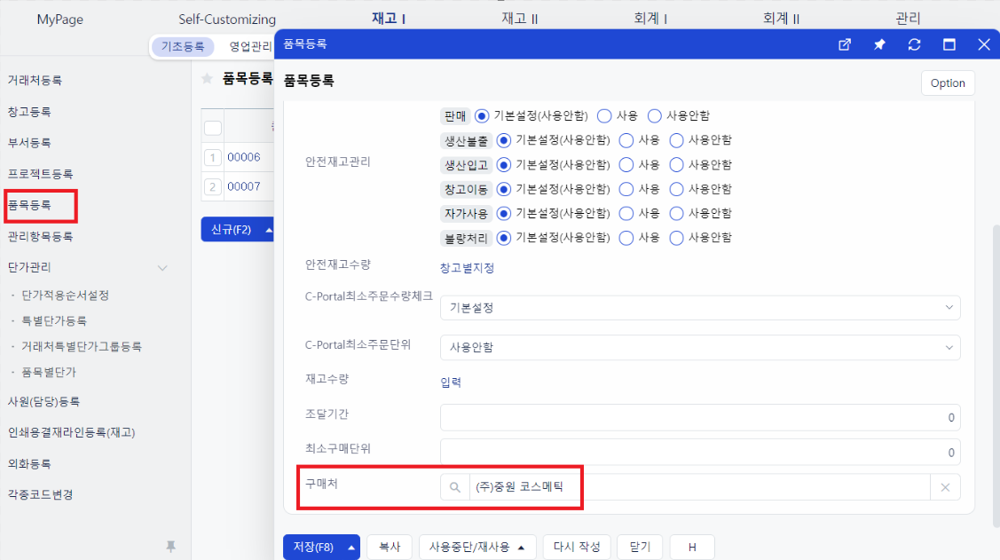 경로 : 재고Ⅰ- 기초등록 - 품목등록 - 품목코드 클릭 - 수량 탭 - 구매처