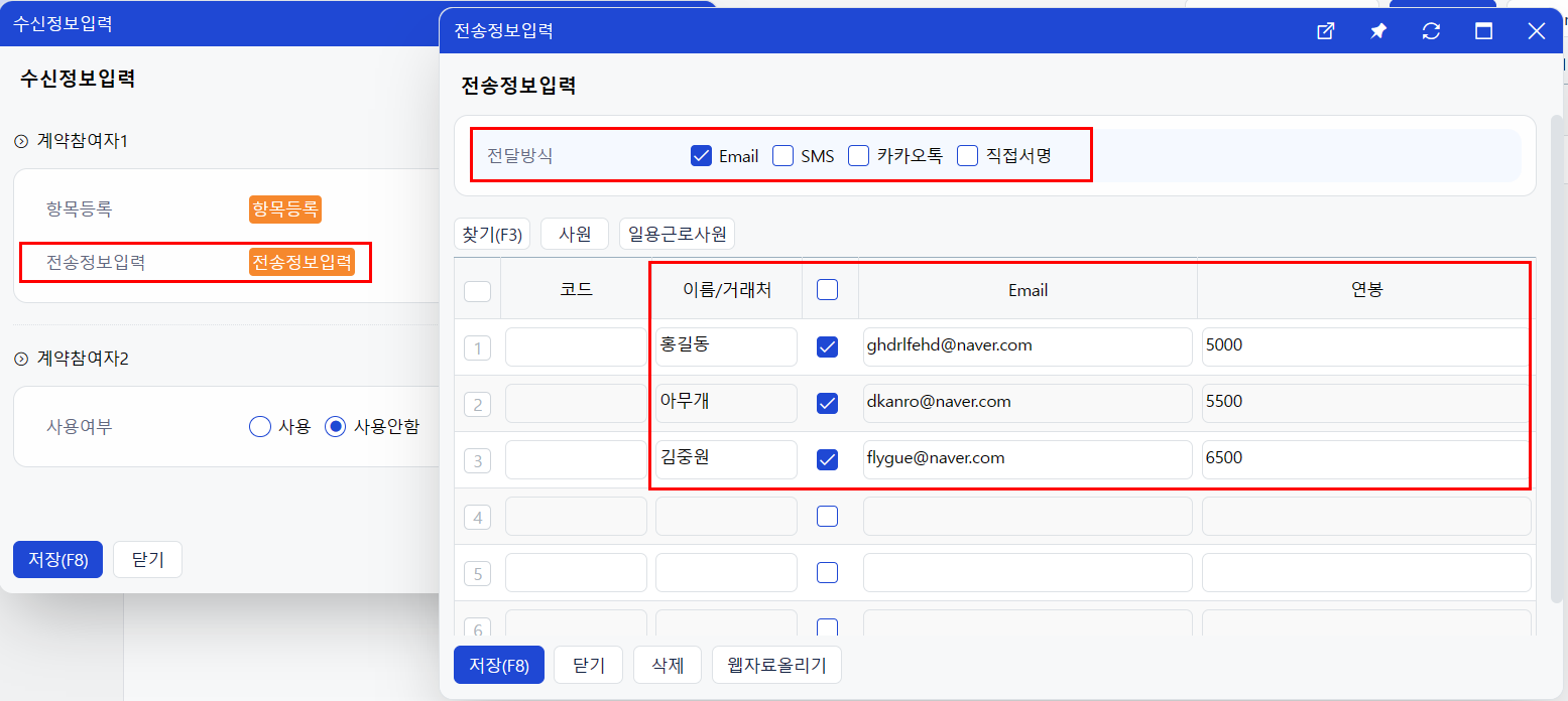 - 전송정보입력 : 전달방식 선택이 가능하며, 계약자에 대한 수신정보를 입력