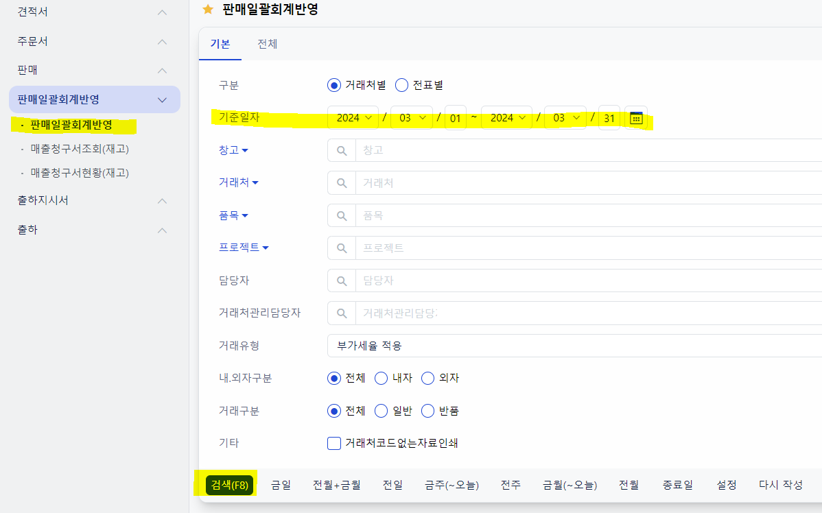재고Ⅰ- 영업관리 - 판매일괄회계반영 - 기준일자 선택(기본적으로 지난달 1일~말일) - 검색