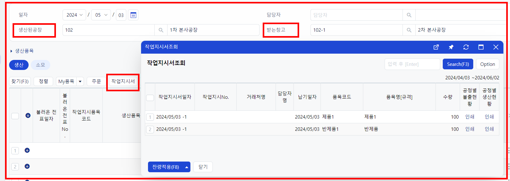 보내는 창고, 받는 공장 입력 후 중간 작업지시서 버튼을 통해 이력을 불러올 수 있습니다.
