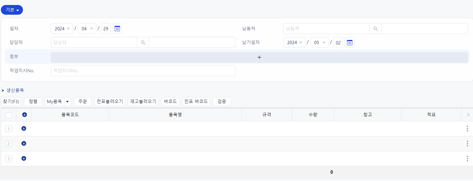제품, 반제품에 대해 생산을 요청/지시하는 내용을 작성할 수 있는 메뉴입니다.