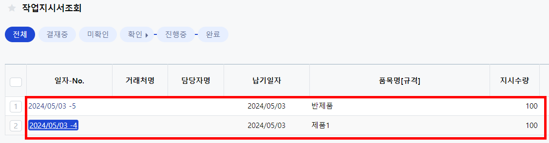 만약, 주문건에 대한 작업지시서 추적이 필요한 경우 주문서 메뉴의 주문서No. 항목 추가 후 작업지시서와 매핑작업을 통해 주문No에 따른 작업지시서 이력관리가 가능합니다.
