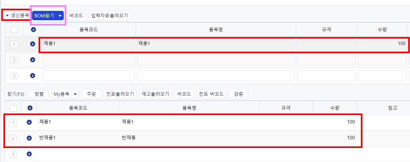 입력 후 BOM풀기 버튼을 클릭하면 하단에 제품1/반제품1이 표시됩니다.