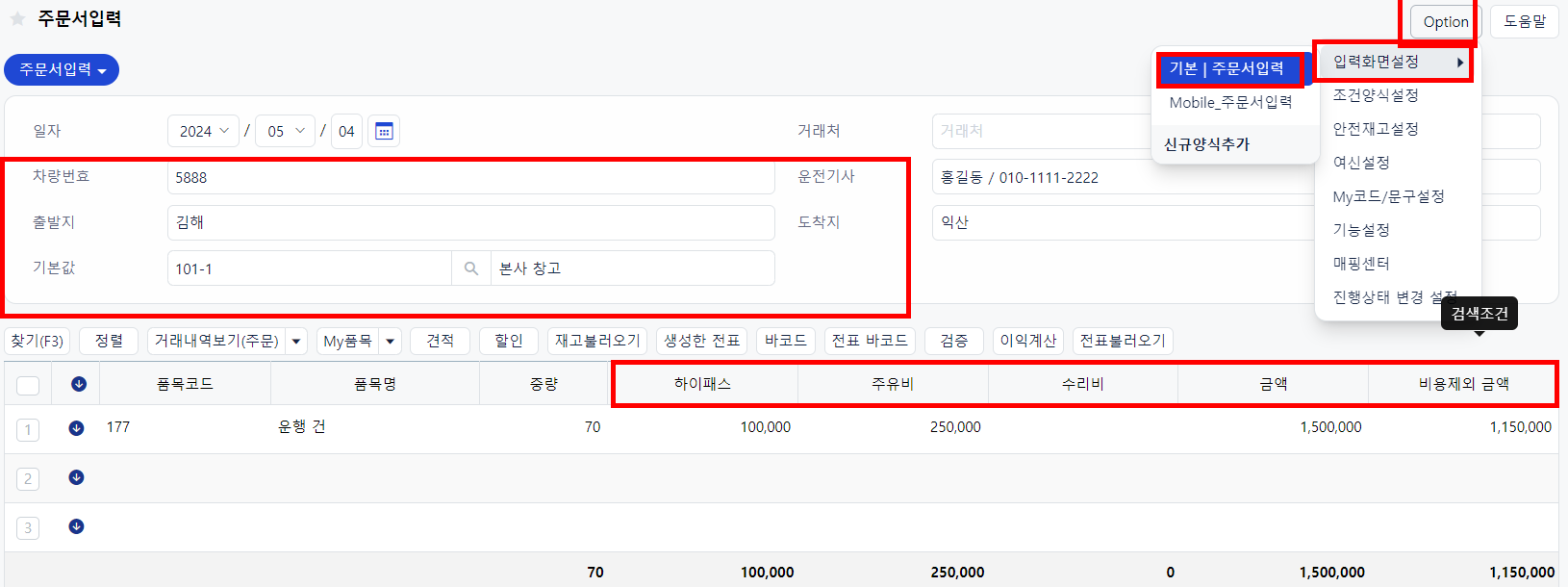 입력화면 양식설정을 통하여 해당 차량 운행 시 발생된 하이패스, 주유비 등 기타 비용들을 입력 할 항목을 추가하여 넣어주고, 하단 비용제외 금액은 계산식 설정을 통하여 금액에서 비용을 제외한 값으로 적용되도록 설정합니다.