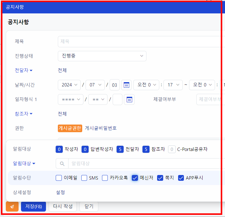 따라서, 전표나 게시글을 입력하고 해당 내용을 다시 전달하기 보다, 쪽지 또는 메신저의 알림을 제공하는 기능도 업무의 효율을 높이는 방법이 될 수 있겠습니다.