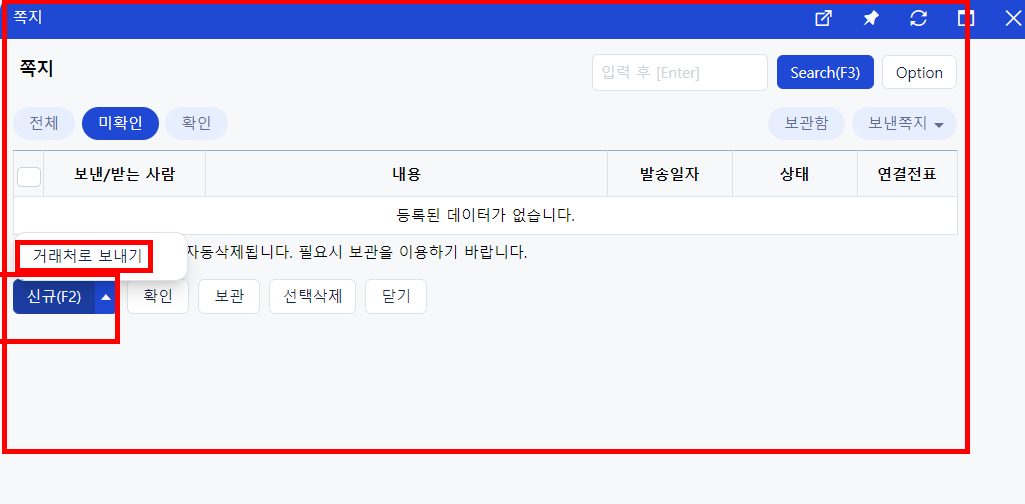 신규 버튼을 클릭하여 다른 사용자에게 쪽지를 보낼 수 있으며, 거래처로 보내기를 클릭하면 C-Portal의 거래처로 발송할 수 있습니다.