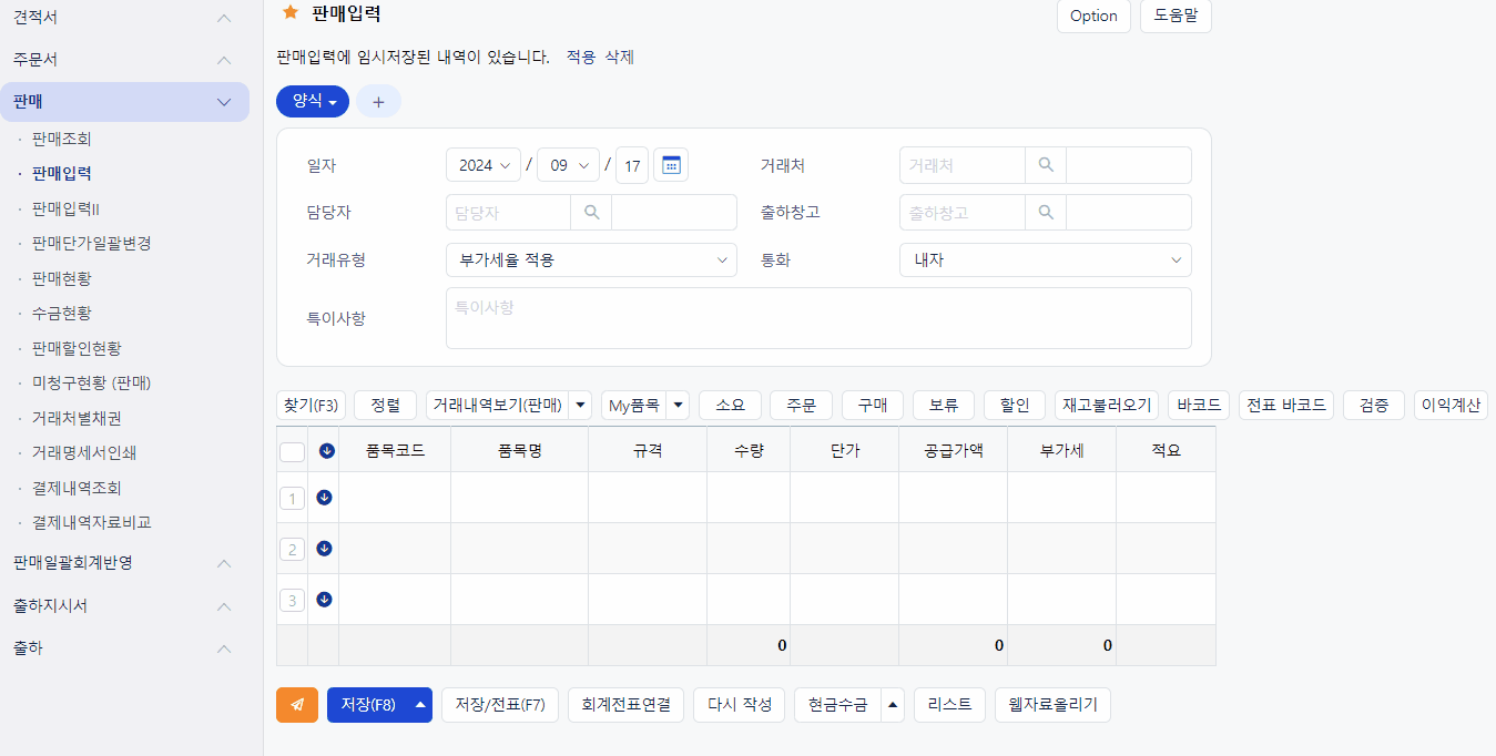 판매입력 시 직접 상단에 '+'버튼을 클릭해 출하지시서를 생성할 수 있습니다.