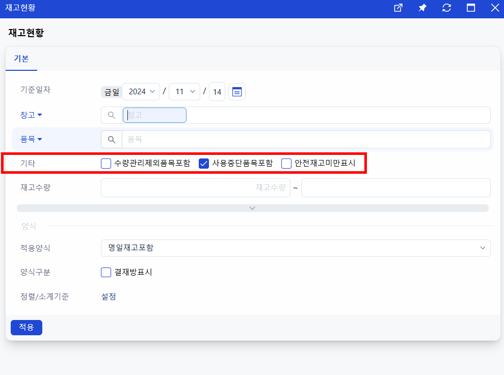 안전재고미만인 품목만 조회하고 싶은 경우 기타 항목의 안전재고미맘표시 항목을 체크해야 조회할 수 있습니다.