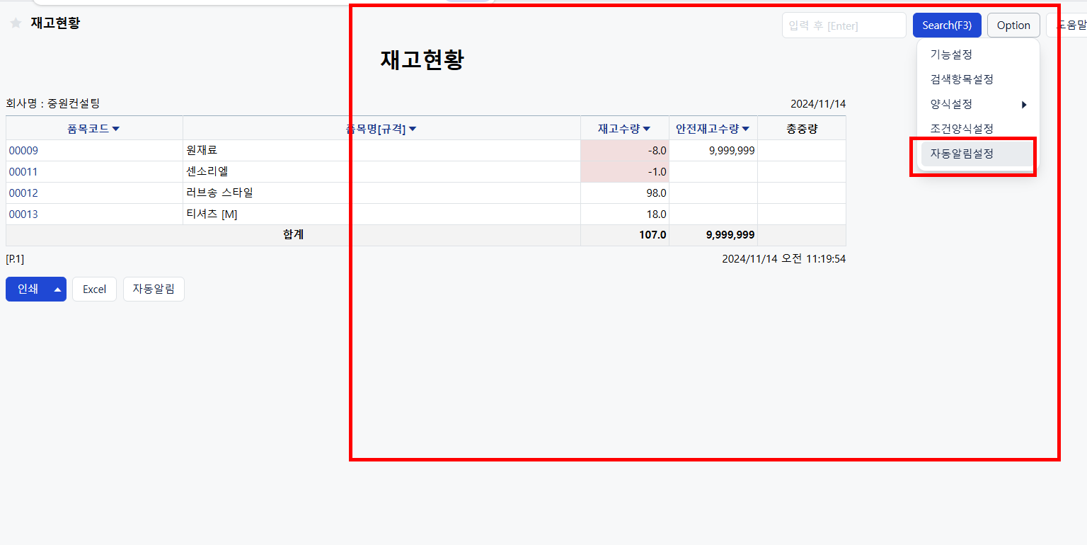 자동알림기능이란, 재고현황, 판매현황 등 출력물에 대해 조건을 설정하면, 해당 메뉴를 접속하지 않더라도 알림을 통해 데이터를 확인할 수 있는 기능입니다.