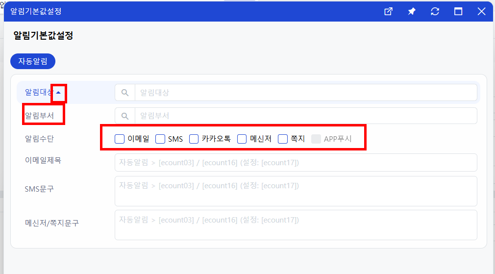 마지막으로 자동화결과의 알림 설정값을 클릭하면 어떤 담당자 또는 화살표를 클릭해 어느 부서로 알림을 줄지 선택할 수 있으며, 어떤 수단으로 알림을 보낼 것인지 설정할 수 있습니다.