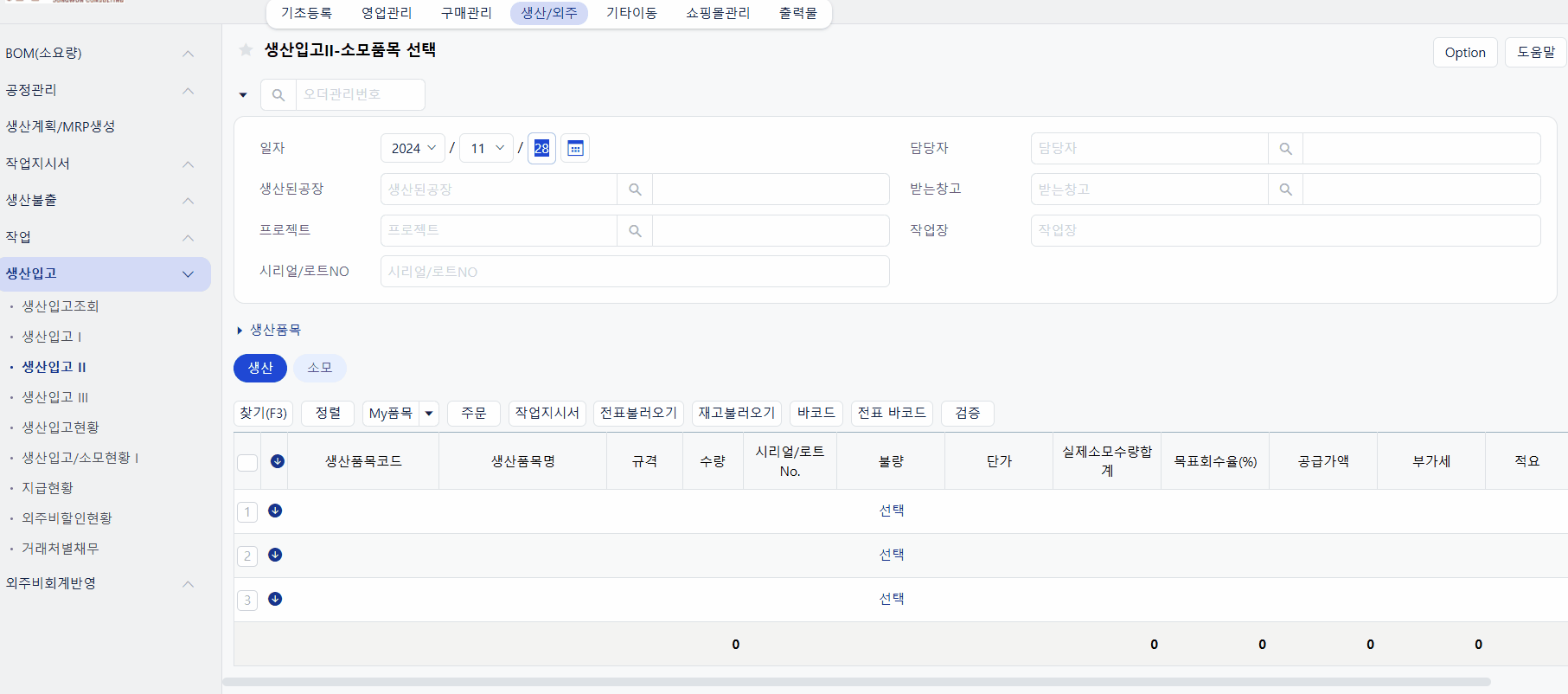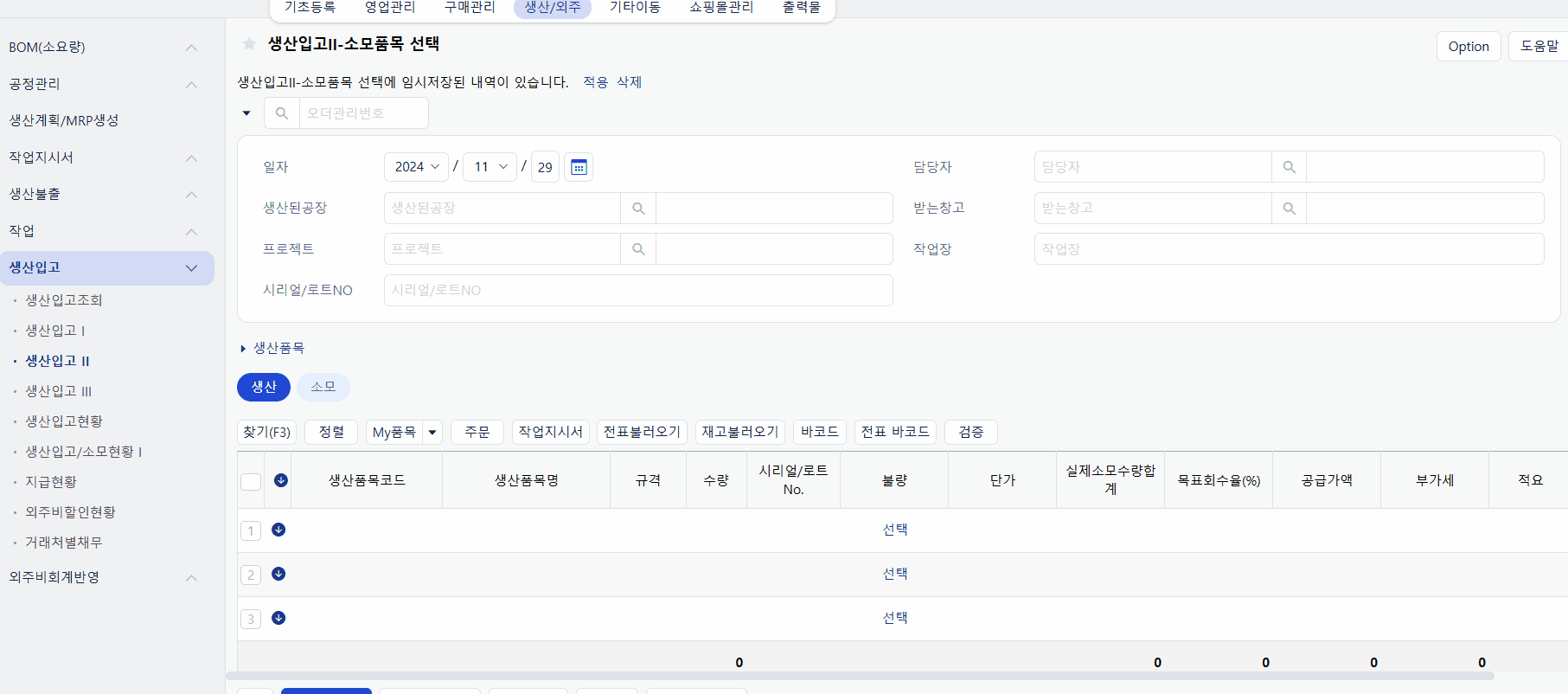 최종적으로 생산 처리를 진행하는 경우, 재고Ⅰ- 생산/외주 - 생산입고Ⅰ,Ⅱ를 작성하게 됩니다.