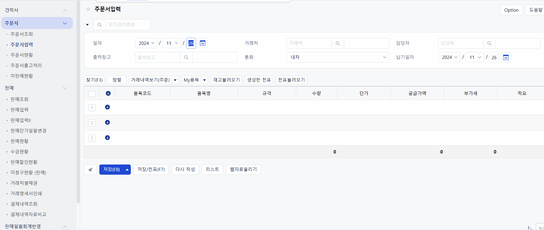 주문서에 불러온 전표의 시리얼로트No.(주문No.)가 불러와지면서 전표 연결이 되는 점 확인할 수 있습니다.