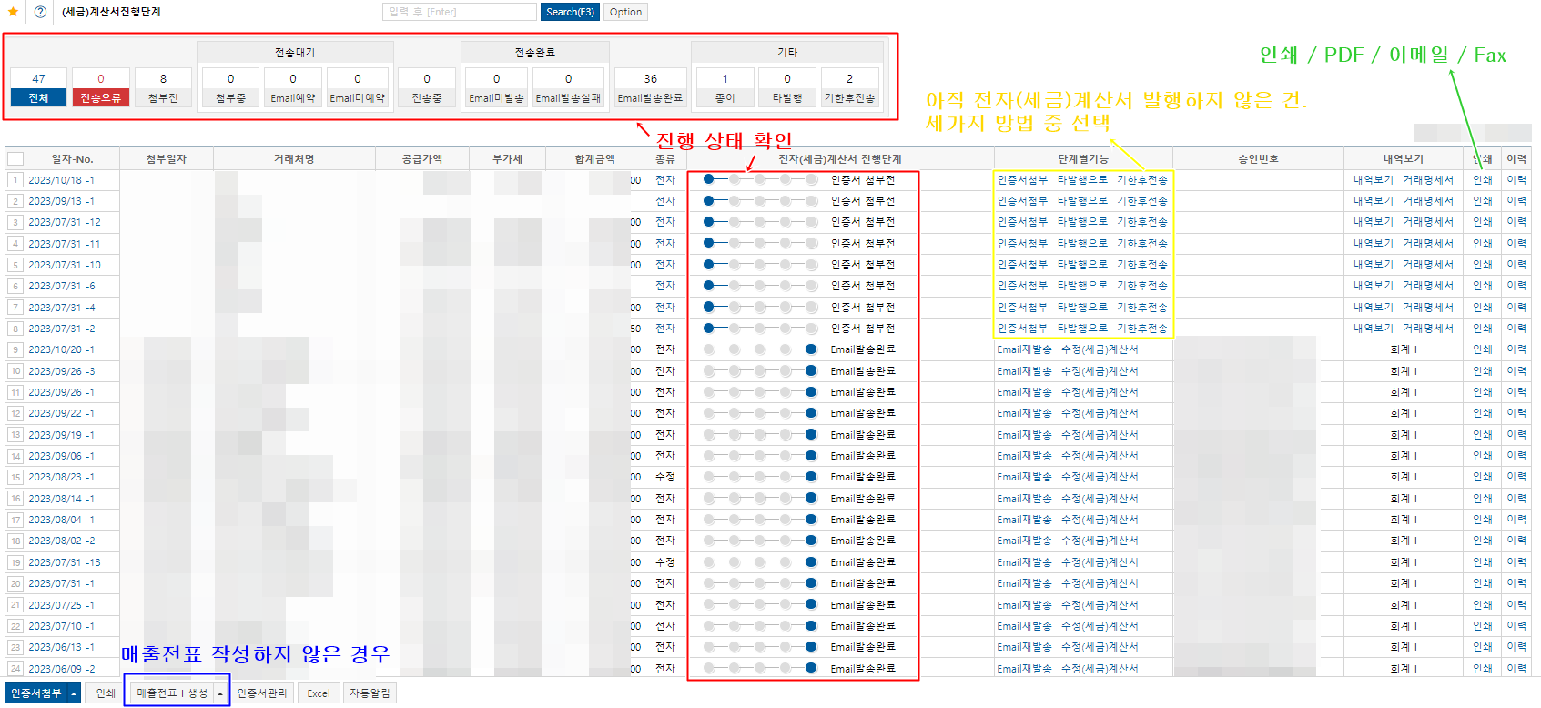 해당 메뉴에서는 매출전표에 대하여 전자(세금)계산서를 발행하고, 각 진행 단계를 확인할 수 있습니다.