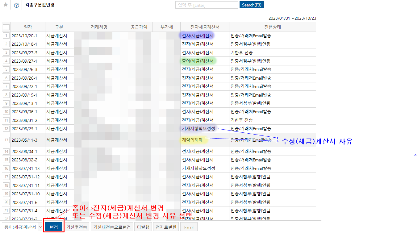각종구분값변경 에서는 작성한 매출전표를 모두 확인하고, 세금계산서 종류와 진행상태를 변경할 수 있는 메뉴입니다.