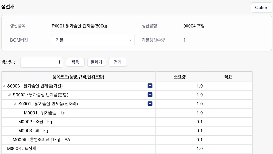 우리가 보고 있는 예시는 공정이 총 4단계 입니다. 따라서 3번의 반제품 생산내역과 1번의 완제품 생산내역을 작성해야 재고수량이 맞게 됩니다. 아래는 닭가슴살 완제품을 만들기 위한 반제품/제품과 하위에 들어가는 BOM 예시 입니다.