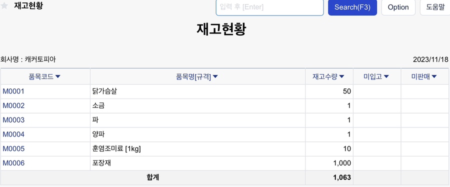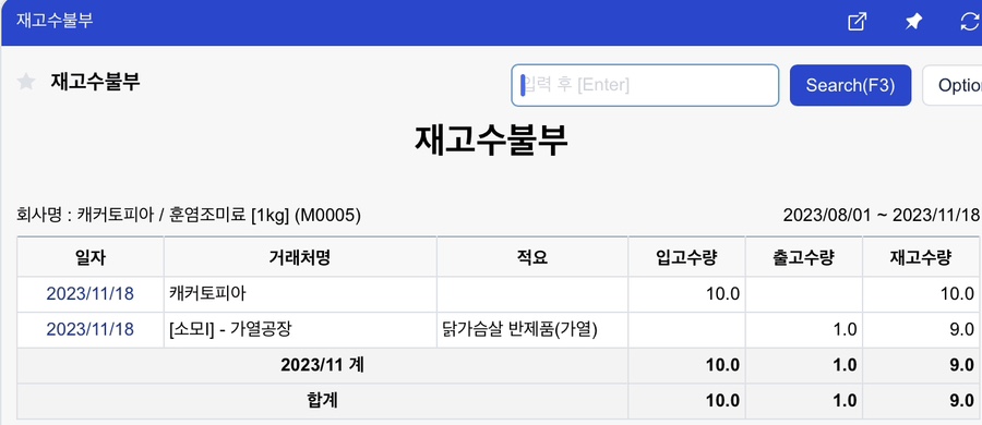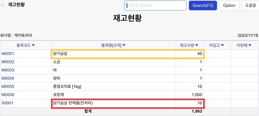 1공정에서의 생산내역 작성이 끝났습니다. 닭가슴살 반제품(전처리) 수량이 10으로 증가하고 관련 BOM품목의 수량이 줄어들었는지는 앞서 보았던 재고Ⅰ- 출력물 - 재고현황 에서 확인합니다.