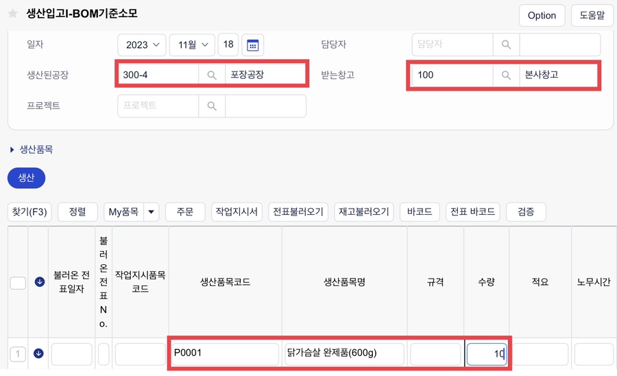 둘 째, 반제품/제품에 대한 생산입고 작성하기