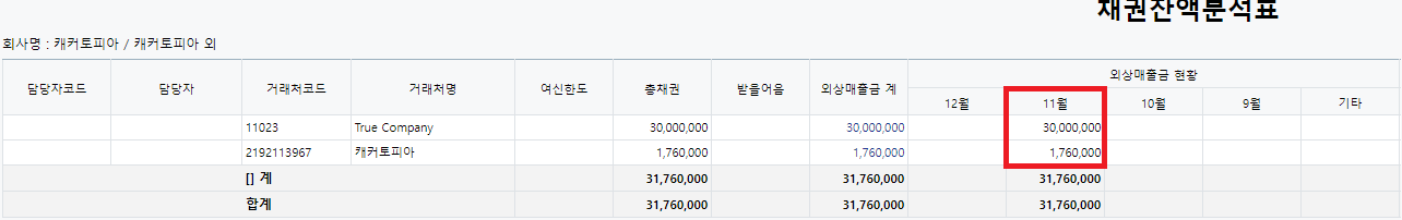 채권/채무회수기간표 > 구분 : 채권 선택을 하고 검색하면 아래와 같이 채권잔액분석표가 나타납니다. 이 장부는 거래처 별로, 월 별로 매출이 일어났을 때, 수금이 일어나면 잔액을 가장 처음 매출이 생긴 월부터의 채권잔액을 차감하여 잔액을 월별로 나타내어줍니다. 즉, 선입선출 기준으로 채권잔액을 감소하여 월 별로 채권잔액을 나타내는 장부입니다. 거래처들로부터 특정달에 일어난 매출에 대한 수금을 받아야할지 확인하는 목적으로 사용합니다.