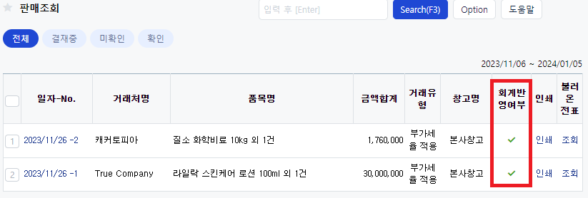 기본적으로 위 회계 관련 채권 출력물들을 확인하기 위해서는, 재고Ⅰ- 영업관리 - 판매입력만 하는 것이 아닌, 해당 판매전표를 회계반영하여 매출전표 또한 작성이 되어있어야합니다.