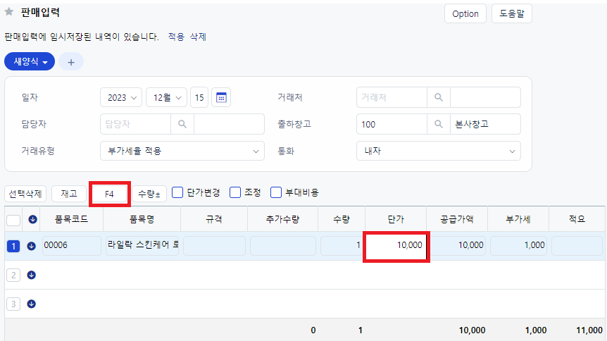재고 Ⅰ,Ⅱ 하위메뉴의 각 전표들에서 단가를 입력할 수 있는 컬럼이 있는 경우, 해당 단가를 공급가액과 부가세로 나눠야하는 경우가 흔히 발생합니다. 이 때 해당 품목을 체크 한 후에 상단의 [F4] 버튼을 클릭하여 나누어도 되고, 아래 화면과 같이 단가 에 커서가 있는 상태에서 키보드의 [F4] 를 클릭하여 공급가액과 부가세를 쪼개어도 됩니다.