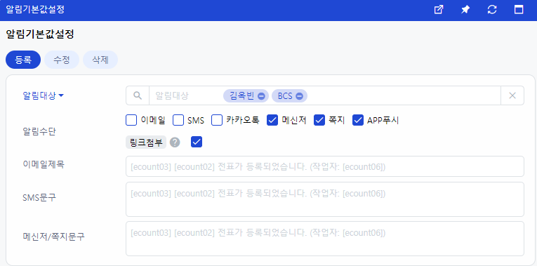 다만, 이 작업을 매번 설정하지 않고 미리 설정해두면 반복작업의 경우 편리해집니다. 예를 들어, 판매입력시 메신저, 쪽지, App푸시 방식으로 김옥빈과 BCS 라는 사용자 아이디에게 알림이 가게 하겠다라고 가정해봅시다. 설정 경로는 아래와 같습니다.