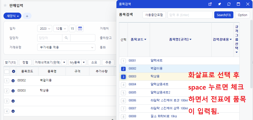 예를 들면, 재고Ⅰ- 영업관리 - 판매입력 - 품목검색창 에서, 키보드의 화살표 위/아래 방향키를 이용하여 이동한 후, [Space Bar] 를 누르면 해당 품목이 선택되면서 전표에 품목 입력이 됩니다. 선택이 완료되었으면 [ESC] 키를 이용하여 품목검색창을 닫을 수 있습니다.