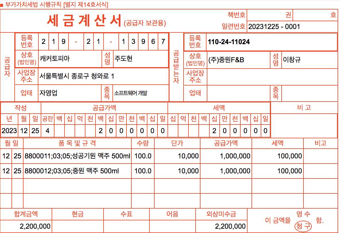 위와같이 처리 후 세금계산서를 출력해보면 아래와 같이 주류세금계산서 형식으로 작성된 것을 확인할 수 있습니다.